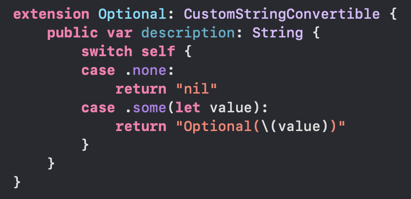 옵셔널 값의 문자열 표현은 'CustomStringConvertible' 프로토콜을 통해 정의 됨